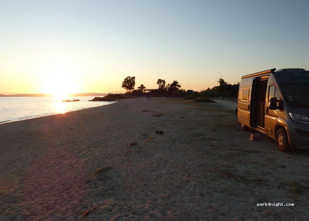 Lovely parking, on the beach. Quiet and relatively clean. Good access road. Bins nearby. Bar and taverna closed.