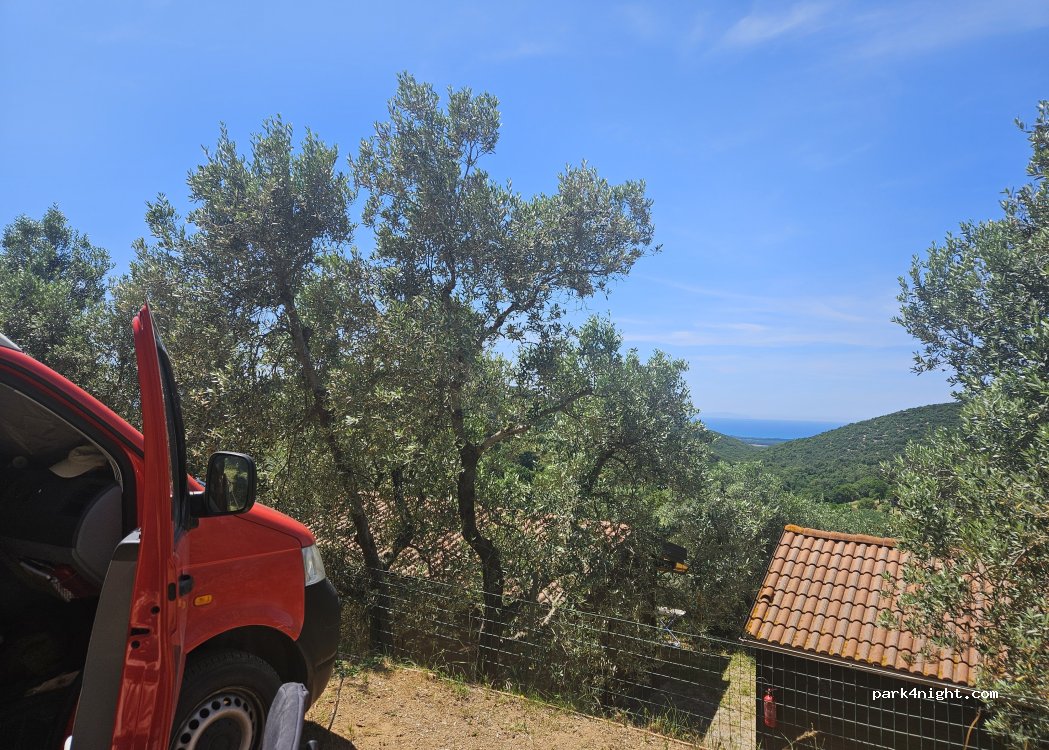 Großer Platz (ca. 90 Stellplätze) mit Pool umgeben von Olivenbäumen und tollem Blick aufs Meer und die Berge! Besitzer sprechen Englisch. Garten und Anlage insgesamt sauber, kein Highlight. Sanitäranlagen älter und Sauberkeit ok. Damentoiletten leider am Abend sehr verschmutzt. Nette Bar mit günstigen Getränken!
