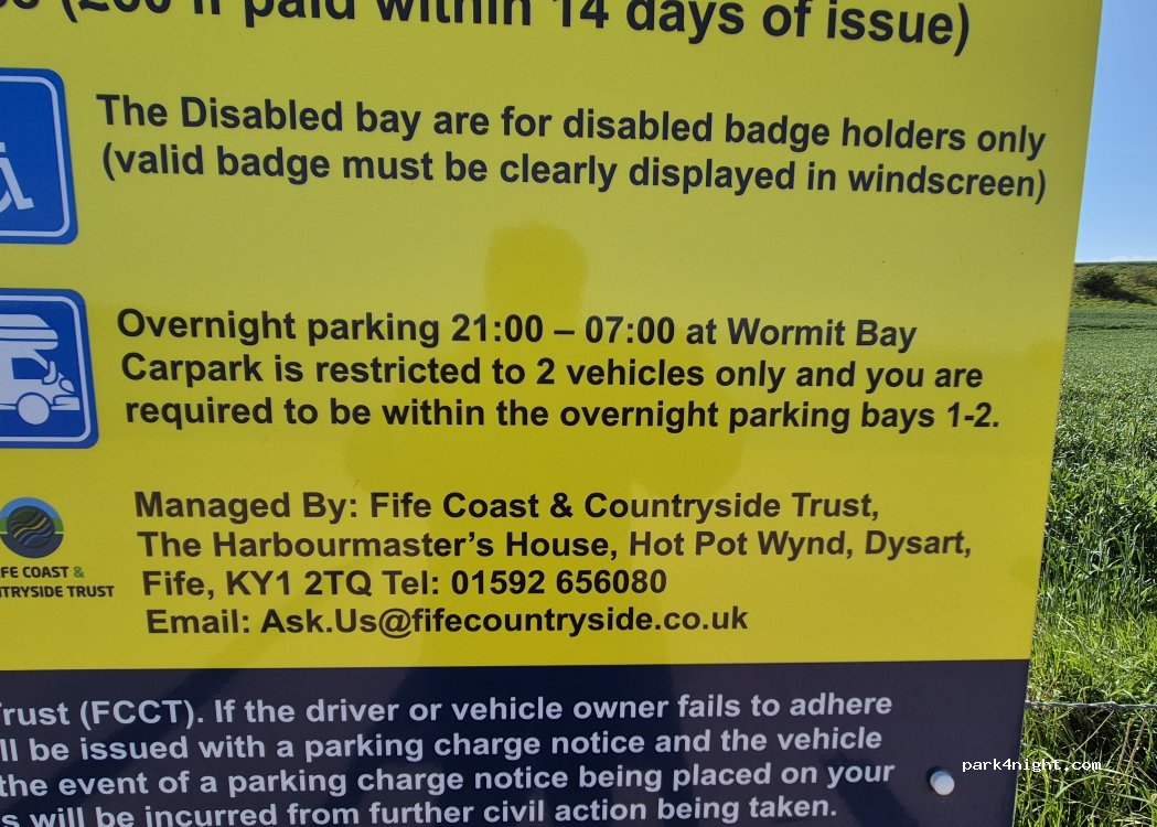 Great views! Only 2 bays available for overnight parking. Use of honesty box to pay £5. Sign says they monitor and ticket those not following the rules posted on sign. Right beside water & narrow roads to access.