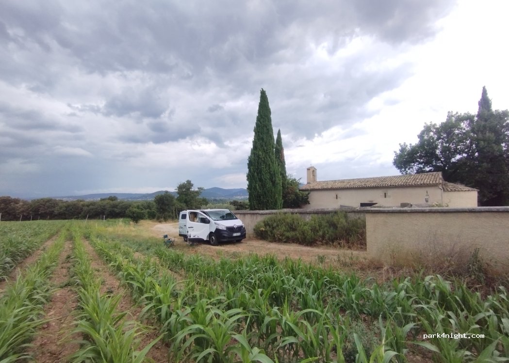 Superbe lieu à côté d'une chapelle. Terrain plat. Possibilité de se garer devant la chapelle, ou sur les côtés pour plus de tranquillité. En surplomb de la route, mais route peu passante la nuit. Au milieu des champs, et avec une belle vue pour le couché de soleil. Nous recommandons ce lieu.
