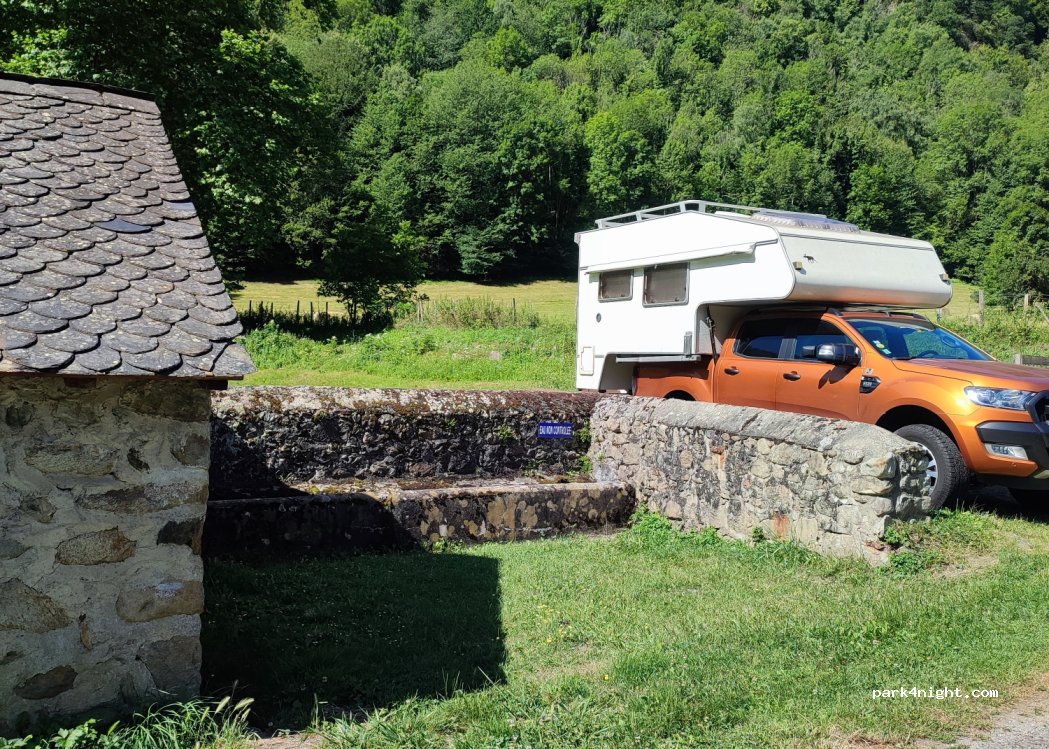 Nous avons eu la chance de croiser la mairesse du village qui passait par là en voiture et qui nous a confirmé qu'il s'agissait bien de l'endroit réservé aux CC . endroit calme, pleine nature, vue magnifique , se garer entre les poubelles puis le muret de la fontaine .2 places possibles. le village à pied n'est pas loin avec son café restaurant sympathique . 4 euros le demi est un peu exagéré!