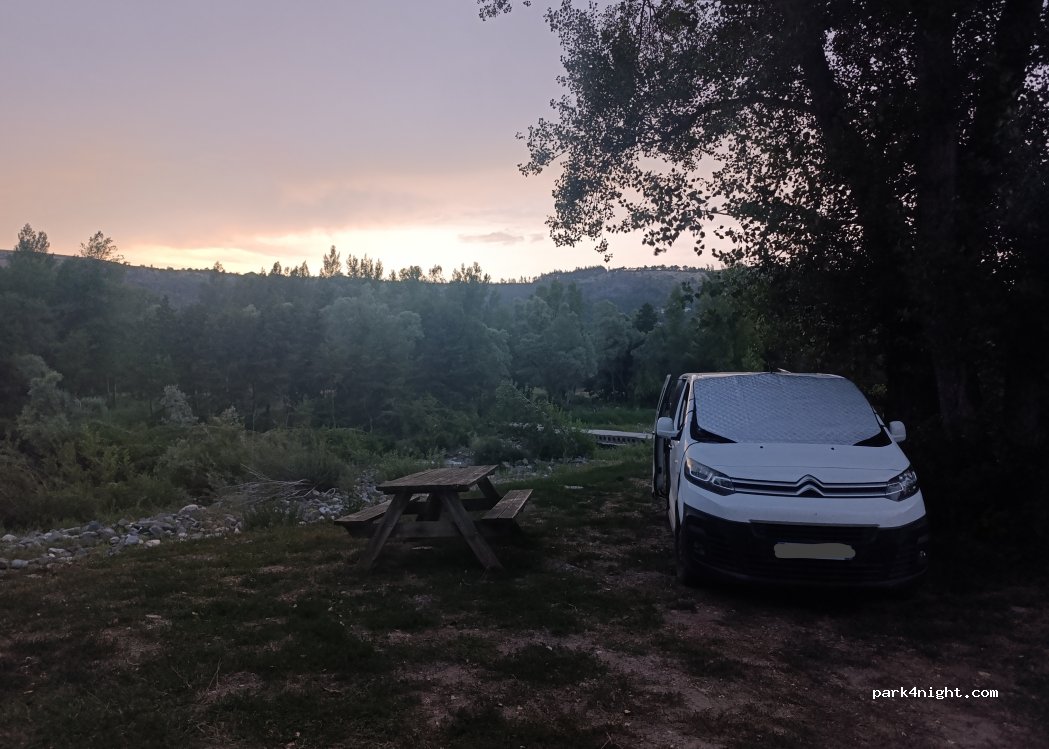 Très bon spot au calme proche de la rivière on était que 3 vanlifers 3 tables pour manger on a passé une très bonne nuit passage des éboueurs a 6h30
