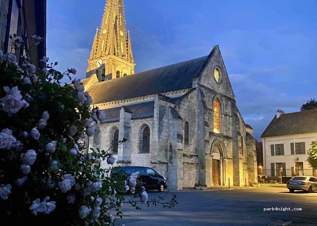 Aparcamiento de la iglesia de un bonito pueblo, a 15 min del parque Astérix y con una panadería cerca. Tranquilo y con plazas bastante bien niveladas, recomendable.