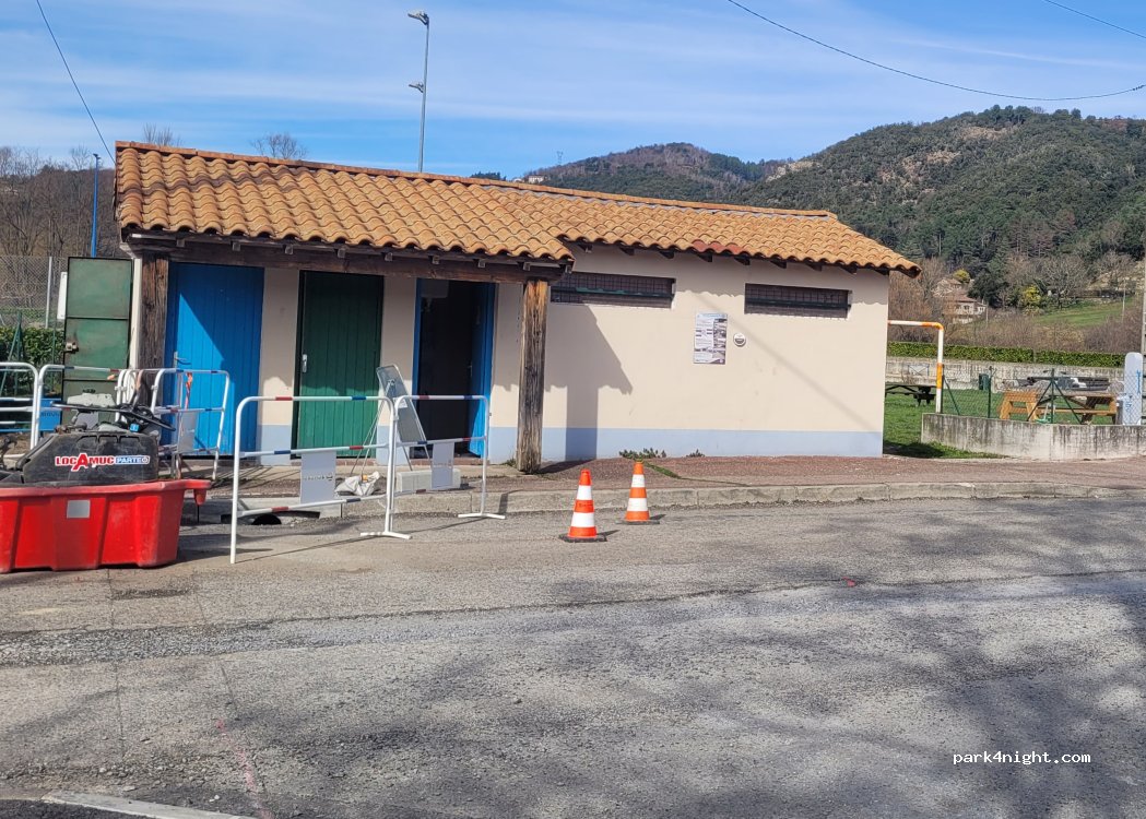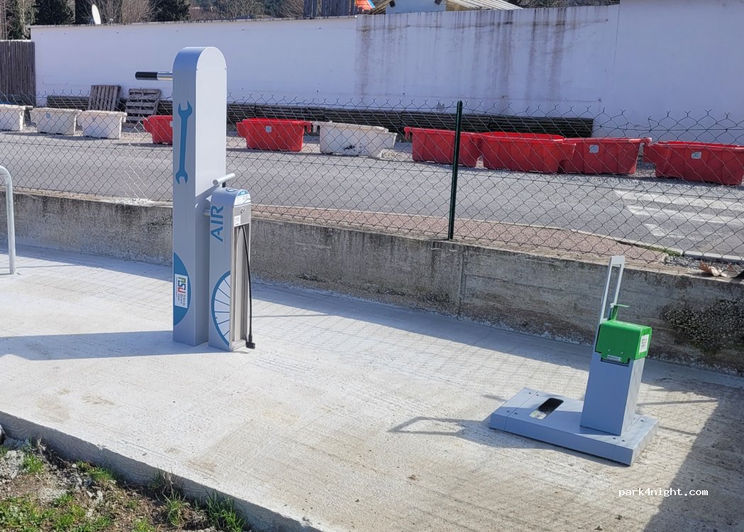 Il y a un wc et un coin vélo gratuit (quelques outils, un gonfleur-mano-manuel,une prise pour recharger les vélos ou autres). Voir les photos.