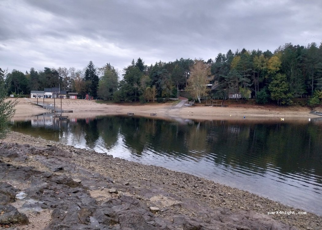 Parking réservé véhicules « hauts » donc pas de portique à l’entrée. Suffisamment grand pour stationner une dizaine de CCAR si pas trop de voitures. Base nautique, plage et restau à 5min à pied. Toilettes et douches accessibles au niveau de la plage Actuellement pollution de l’eau aux cyanobacteries :( dommage pour la baignade et le paddle