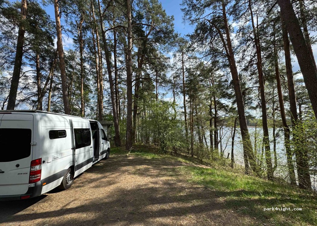 Quiet and beautiful spot. There’s a roughly 200m stretch of narrow, bumpy path with lots of tree roots. I wouldn’t recommend going there with a large camper, but a campervan is fine. Enough space for 2–3 vans with a view of the lake.
