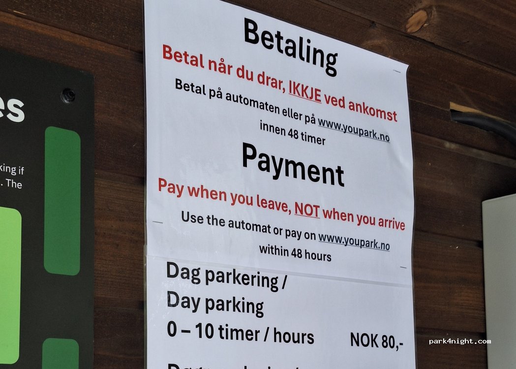 Automatické parkování. Vjezd a výjezd zaznamenají kamery, placení pak online přes web. Placeno 80 NOk/ 3 Hodiny