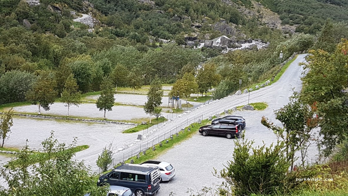Schöner Parkplatz der auch mit Keilen nicht gerade wird. Kostet 7-23Uhr 50NOK. Und 23-7Uhr 160 NOK. Stolzer Preis für einen Parkplatz ohne nix. Aber grandiose Aussicht auf einen Gletscher und mehrere Wasserfälle.