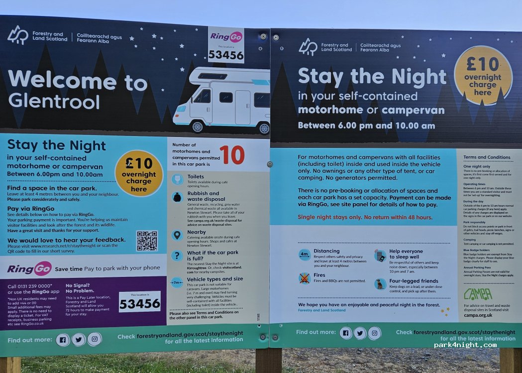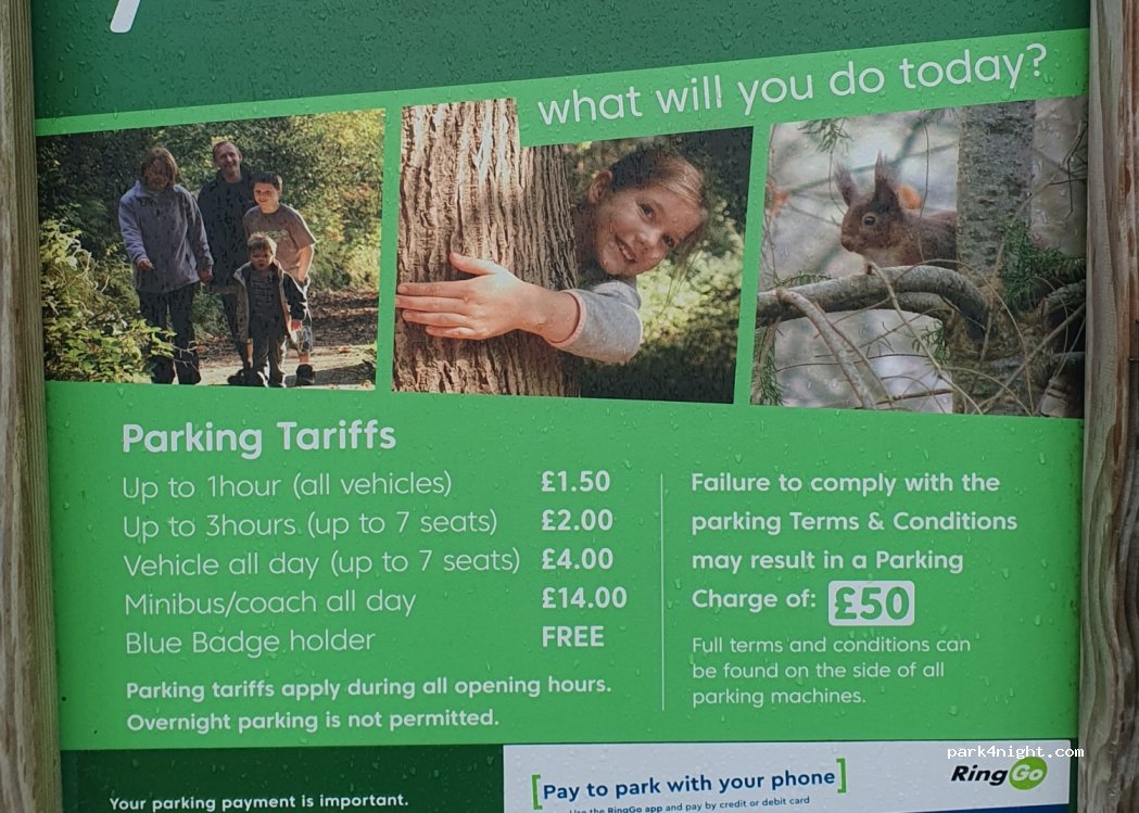 lovely location, £10 overnight charge 6pm - 10am. full mobile signal, flat, visitor centre & toilets open 20am -4pm. plenty of free parking further up the valley but no mobile signal.