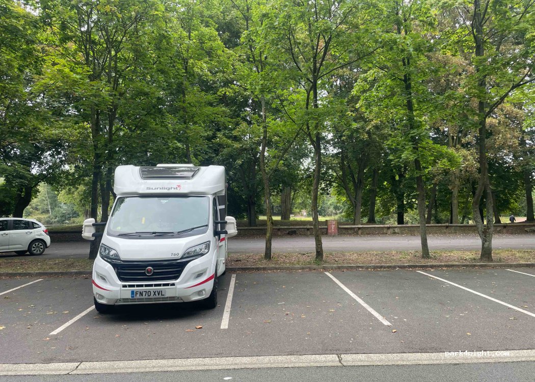 Level and hardstanding car park in the shade, next to a large park with lakes. Quiet at night. Might be difficult for long vehicles.