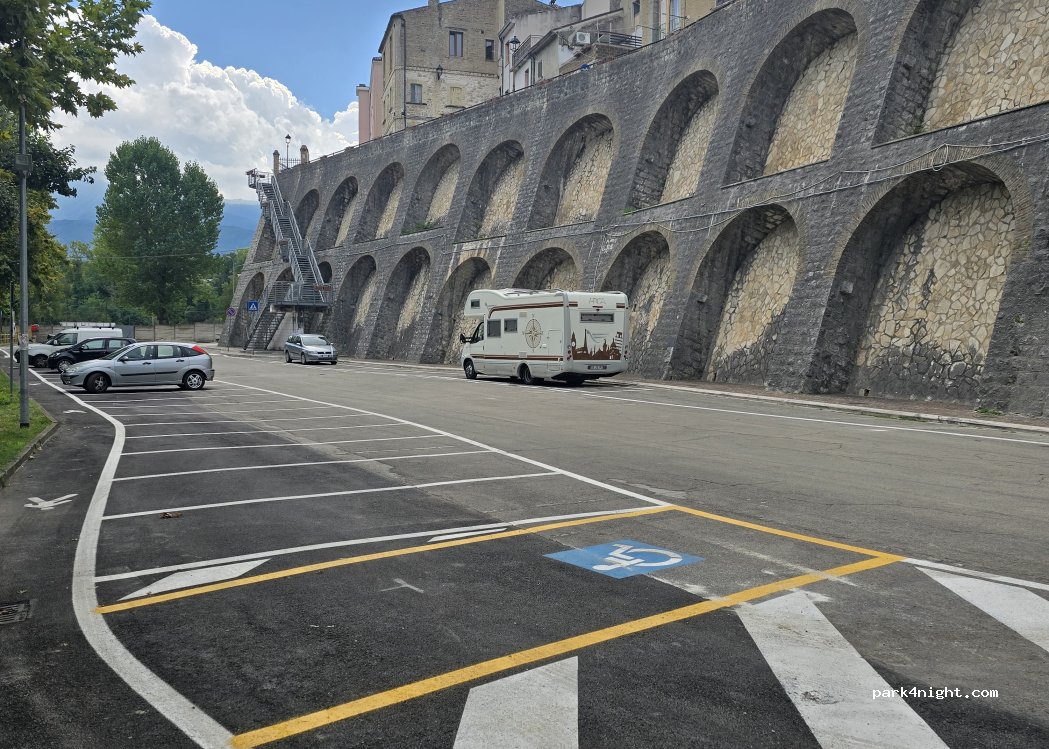 Free parking area with water drain, slightly inconvenient location but spacious enough to maneuver, good pizzeria, restaurant with adjoining lake for fishing.....beautiful town, panoramic bridge overlooking the river. Not well signposted. Adjacent parking area with parking prohibited on Wednesdays from 6am to 3pm