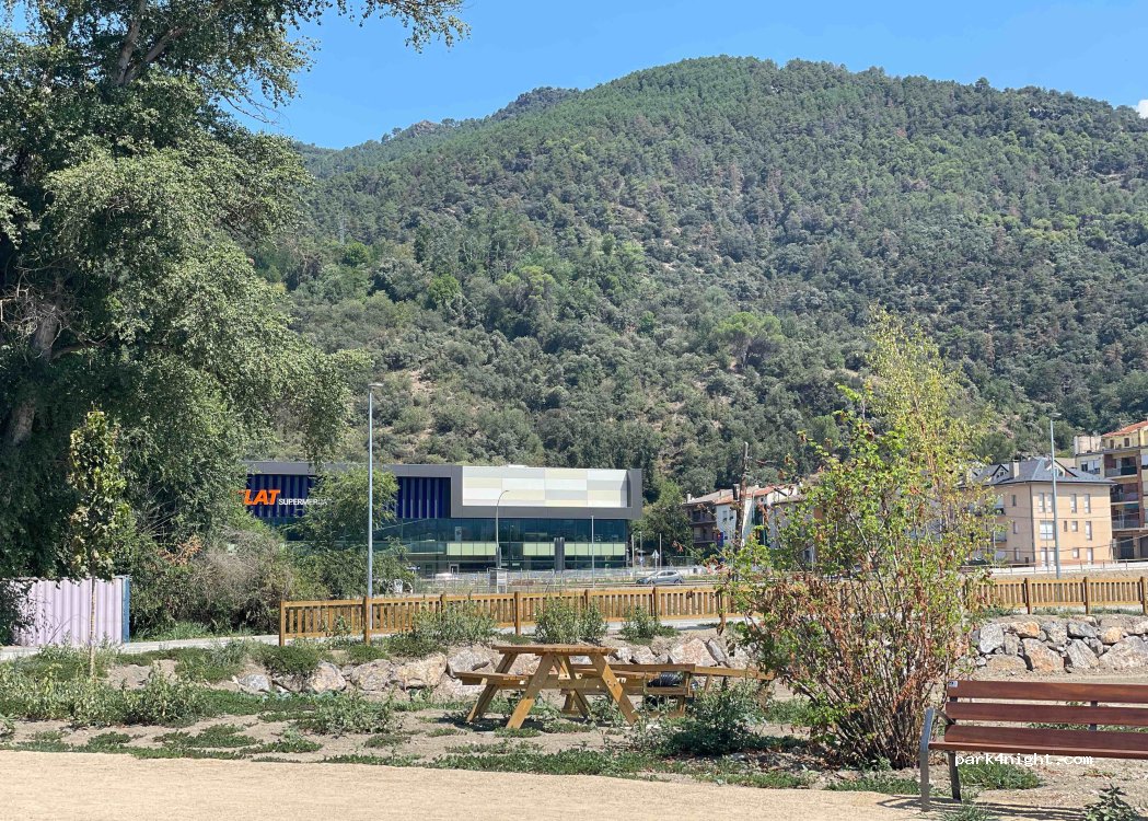 This is on the edge of the circular cycle track and just along from the Olympic site. Room for a couple of vans with a bench and a tap you can’t attach a hose to. We parked here as the town was full during the Spanish holiday. Lots of walkers and cyclists until dark