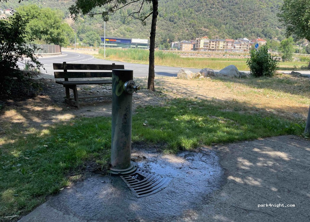 Au bord de la piste cyclable circulaire et juste le long du site olympique. Il y a de la place pour deux fourgonnettes avec un banc et un robinet auquel vous ne pouvez pas attacher de tuyau. Nous nous sommes garés ici car la ville était pleine pendant les vacances espagnoles. Beaucoup de marcheurs et cyclistes jusqu'à la nuit