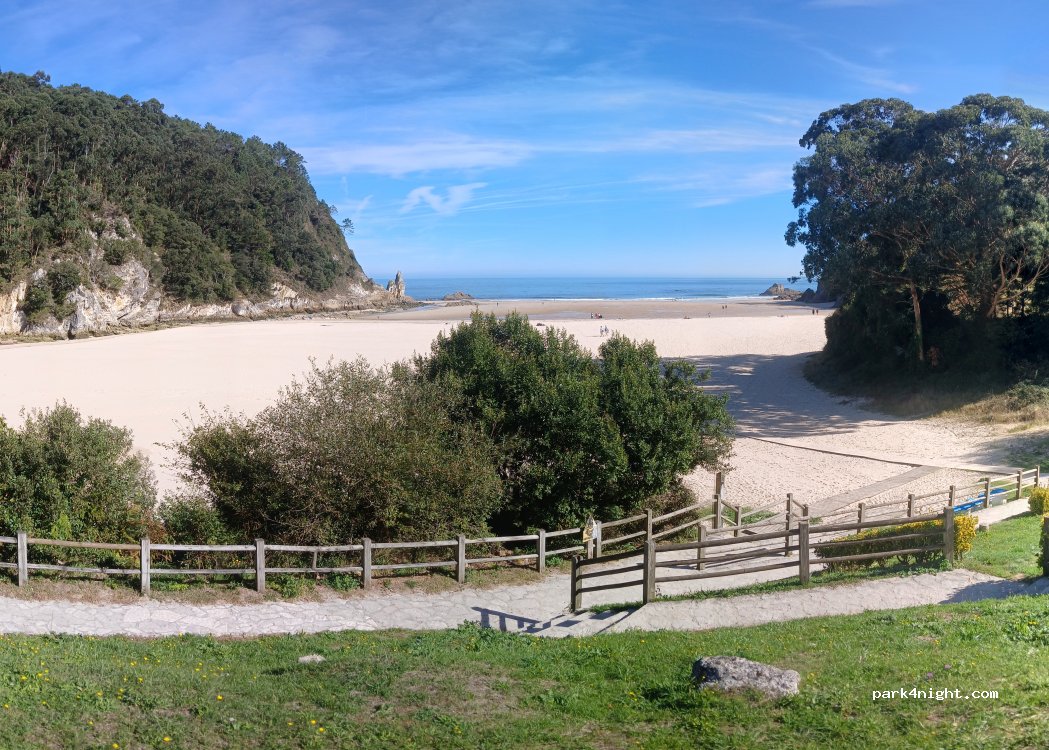 Prohibido para vehículos de más de 5 metros. Duchas y agua en la entrada de la playa, buen sitio para pernoctar con turismos de máximo 5 metros.
