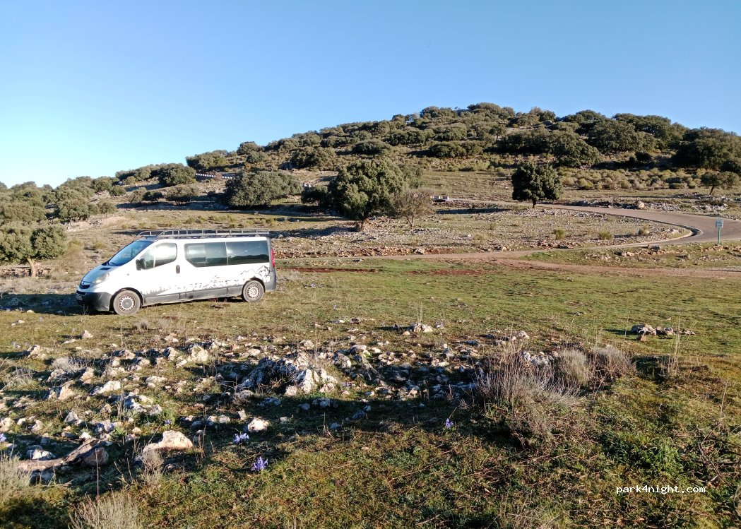 Lugar excelente para noche y excursiones. Salen varios caminos por la Sierra. Noche muy tranquila. En fin de semana se llena de coches de excursionistas, pero ningún problema.