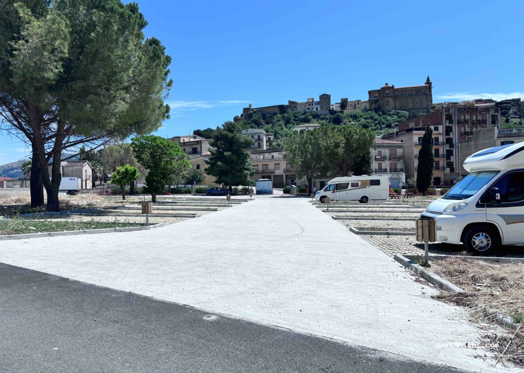 Parcheggio ai piedi del paese (consigliabile andare a piedi al paese perché strade molto strette e con balconi bassi). Tranquillo con circa 10 piazzole individuali ma senza acqua né scarico. c'è una fontana con buona pressione uscendo dal parcheggio si va a sinistra e vi troverete la fontana sulla destra.