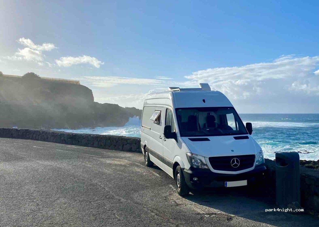Large parking lot next to “piscina natural” and very wild sea. Good place to stay for the night. Illuminated at night. Basic toilets. Great views