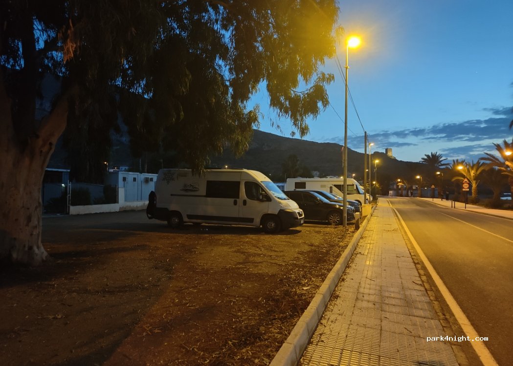 Nice parking just off the road overlooking the sea. I parked here all day and walked the coastal path to the Bateriade Castillitos as it is busy and felt safe. I moved to the stoney gorge for the nice quiet night. This parking is on firm sandy yellow soil which could get muddy in wet weather.