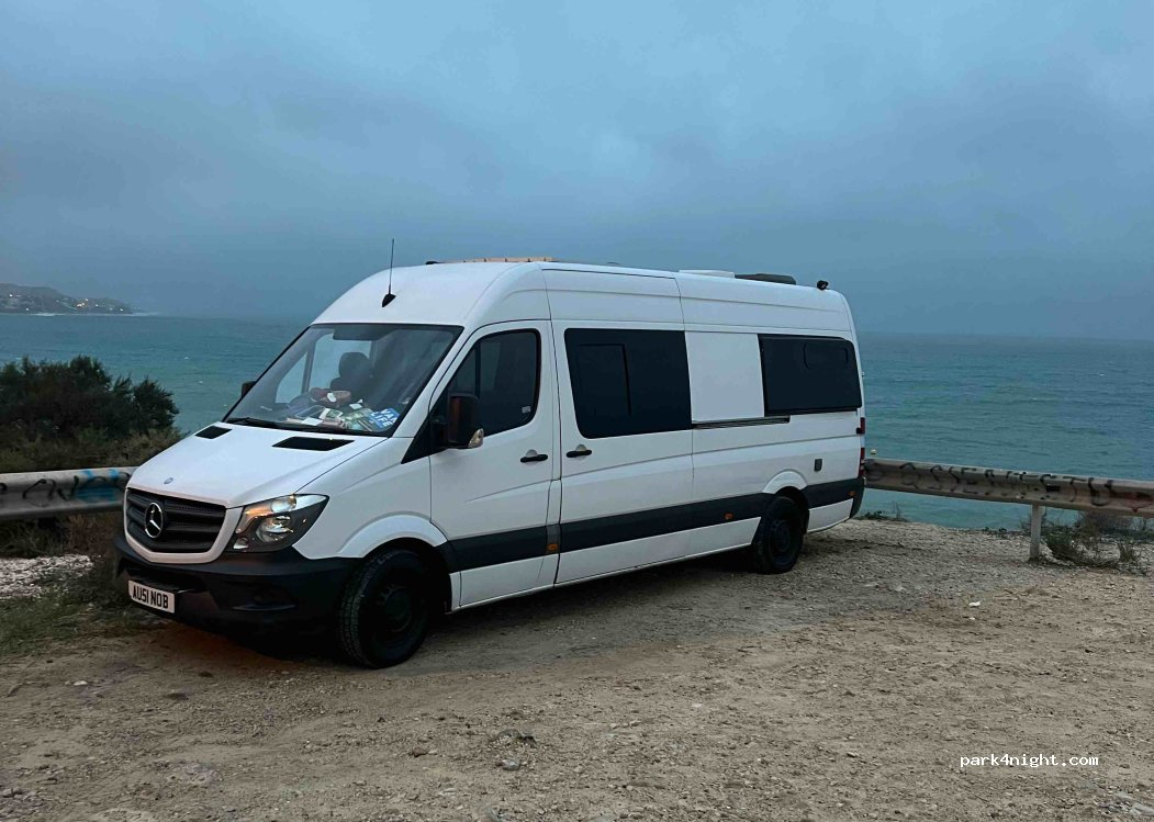 Beautiful sunset and sunrise. Ground is a bit uneven so take it easy going in and take your time parking up to be level. exit tricky due to uneven ground but just take your time. 4 other vans and plenty of room . Noisey until 11.30pm with a crowd of youngsters in cars playing loud music but settled after that and the night was peaceful . Easy flat cycle into Alicante