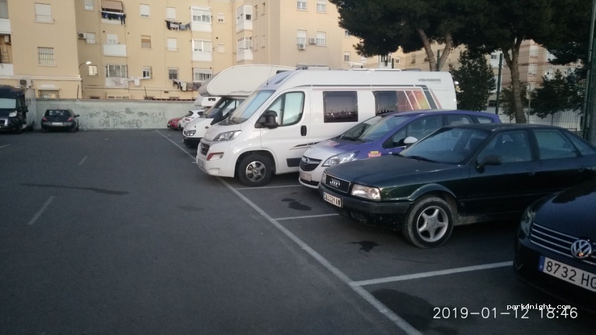 Parking del campo de fútbol. Las plazas pegadas al muro dan para aparcar hasta 6 metros. Tranquilo, con tiendas cerca. Sin servicios.