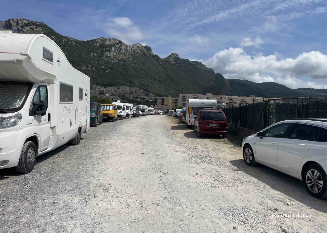 A nice place to park our motorhomes with view of the beach and the mountains. No sign of police reinforcing prohibited parking for night sign. There were many vans and motorhomes. Beach shower. Problem on the Saturday night we were sleeping there was however the noise of people walking by talking loudly through the night up to 5/6 am. Next time would park at end of village near large car park.