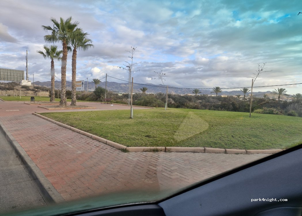 Very tranquil street spot near the high chimney, with nice views, including the castle. I really enjoyed this place. Much better than the nearby approach road to Mercadona where campers often park. Spent several days and nights here with no issues. If you go south straight to the beach (about 700m?) you will find good water taps (foot showers, so take a funnel).