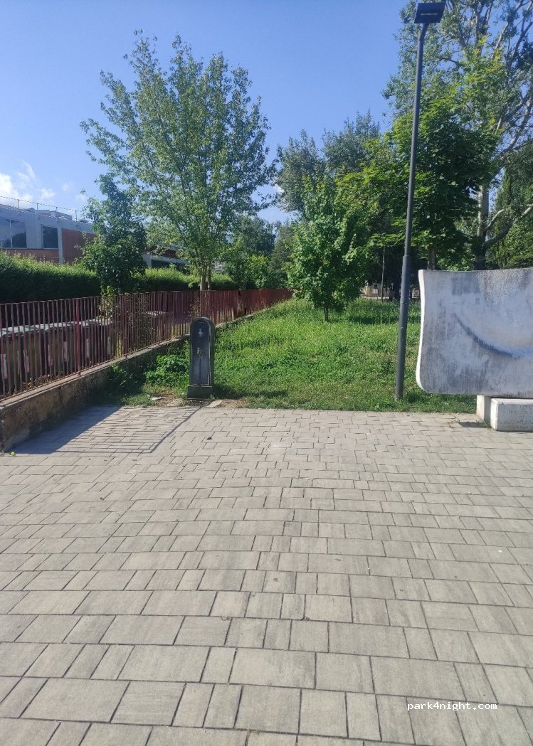 Nice big Parking lot with few shadow slots. There is a kindergarden and a school nearby, so a lot of traffic in the morning from 7. If you need a toilet (or coffee or food), theres il fornaccio, a nice bakery around the corner with a clean toilet.