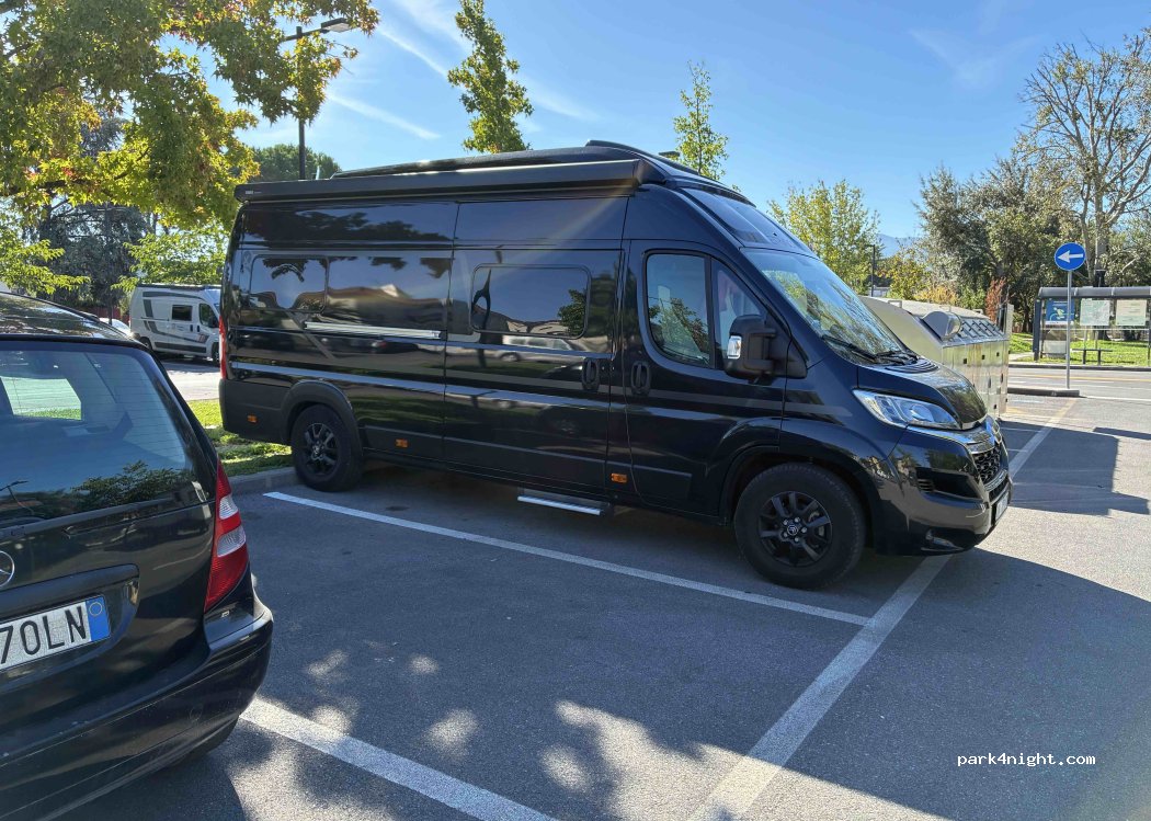 Perfecto parking. Asfaltado, amplio y con plazas grandes. aunque no para más de 7,20m de caravana. Zona residencial, tranquila, y a 15 min andando del centro del Lucca casco antiguo. Recomendable.