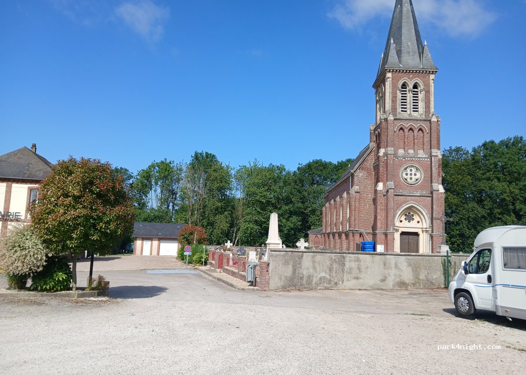 Parking près de la mairie, de l’église et d’une pâture. lieu très calme pour passer une nuit suite à notre retour de Bretagne. Le réveil est réglé à 7 h (90 coups de cloche). Des toilettes sont présentes mais non fonctionnelles lors de notre passage .