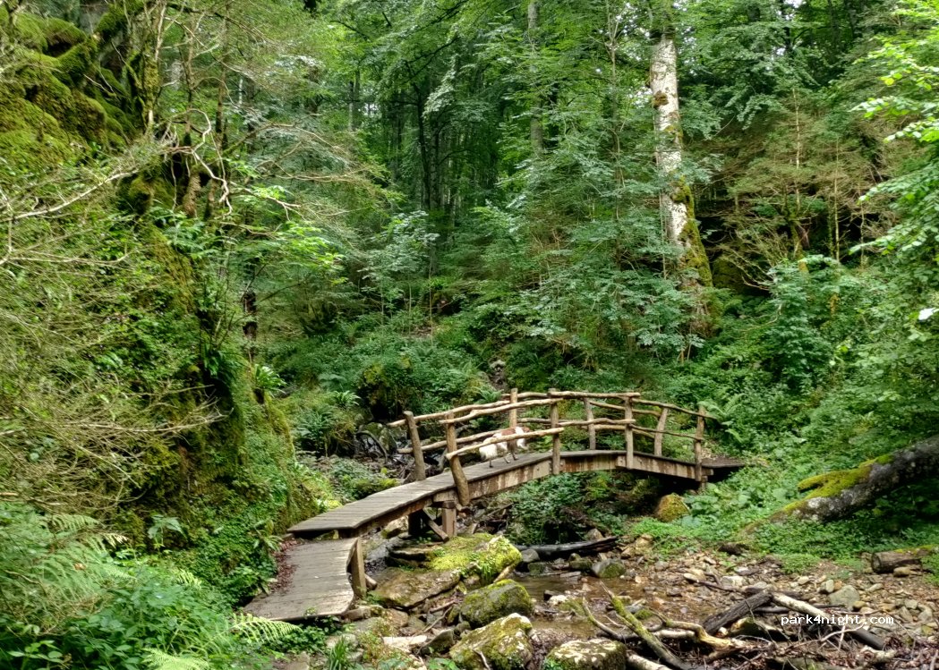 een paar km voor je de plek bereikt is links van het weggetje een veld waar een paar plekjes zijn naast het water. prachtig veld in het mooie bos.