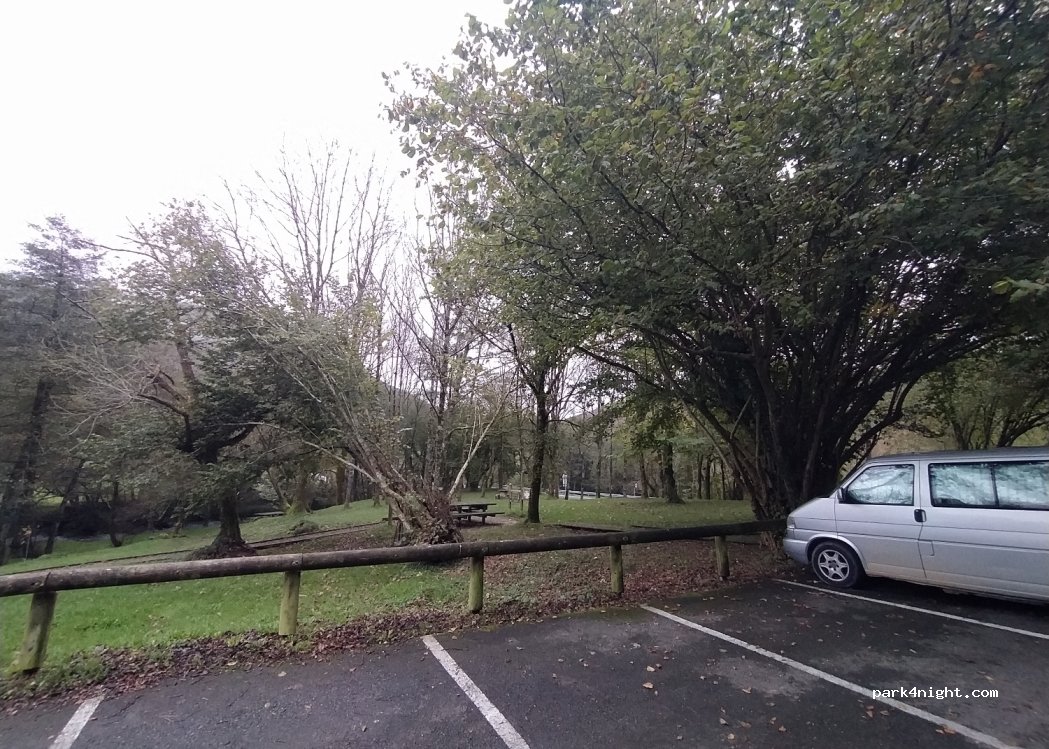 Parking de un merendero rodeado de árboles y un río. Está casi al lado de la carretera pero escuchas mas el río y las vacas que los coches. Perfecto para dormir.