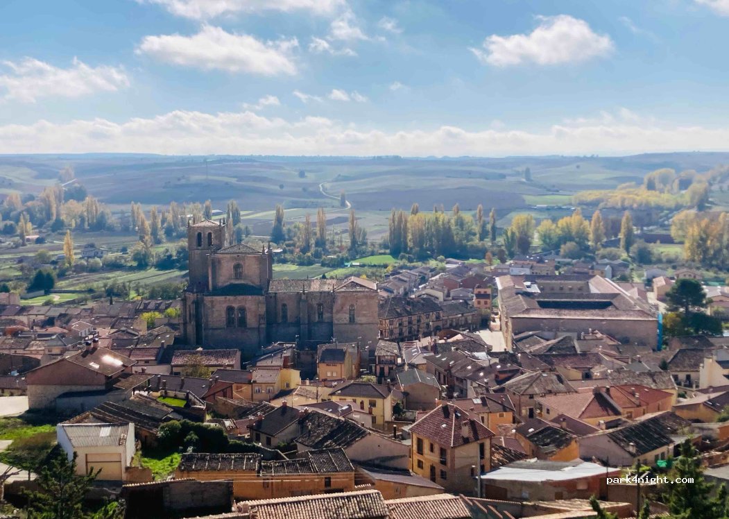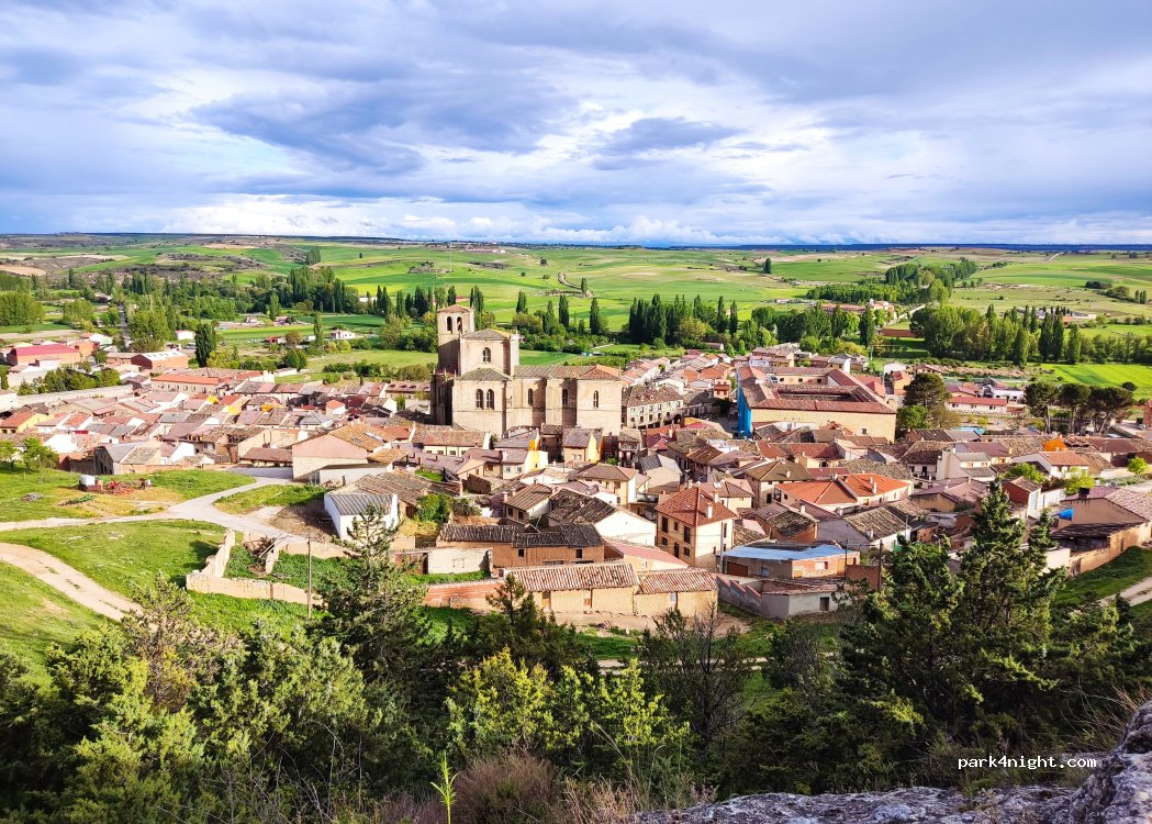 Parking of the castle of Peñaranda del Duero, surrounded by nature and with views of the village and its spectacular surroundings, good quiet place to spend the night, without services.