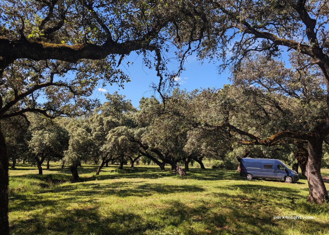 Unterhalb einer kleinen Kapelle kommt man auf diesen wunderbaren Platz. Er ist weitläufig mit vielen Tischen, Bänken und Grillplätzen. Es gibt keine WC's oder Wasserstraßen. Man steht im Schatten unter den alten Steineichen. Einheimische und liebe Hunde kommen vorbei. Von hier aus sind wir nach Almaden de la Platza gewandert. Super schön. Wir können diese Stelle nur empfehlen. Nehmt Müll mit!