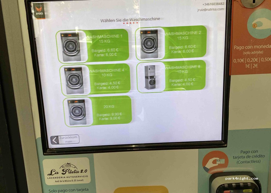 nous avons un camping car de 8 mètres...nous nous sommes stationnés devant...machines impeccables ...il faut payer en liquide ou en Cb...j'ai fais l'erreur d'acheter la carte du pressing...j'ai téléphoner au responsable et celui-ci est arrivé 10 mn après...explication de mon erreur, il m'a remboursé...je recommande...
