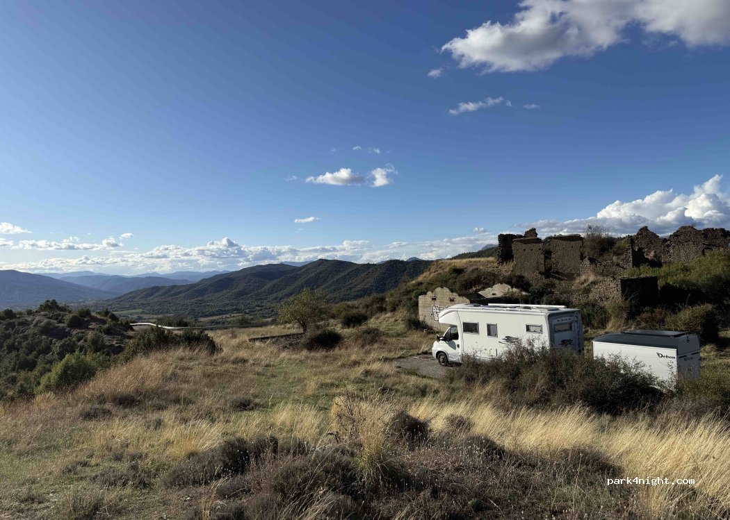 Sitio perfecto para pasar la noche. Entre unas ruinas pequeñas de lo que parece una aldea abandonada. Vistas preciosas y ni un solo ruido. La entrada tiene un poco de pendiente, pero no presenta dificultad y al subir hay una zona algo asfaltada y bien nivelada. Muy recomendable. Fuimos con AC muy grande.