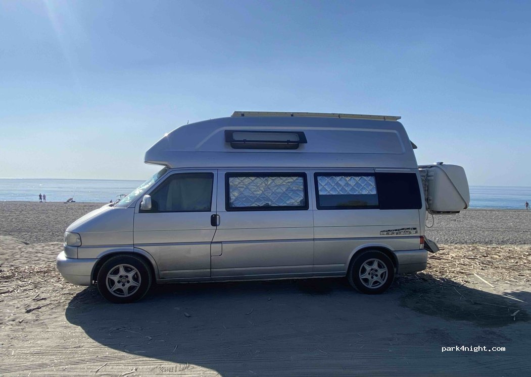 Perfecte parkeerplaats aan het strand! Wij sliepen hier 3 nachten. Er passeerden wel wat auto’s maar de carabinieri kwam af en toe checken. Zij vertelde ons dat het in het laagseizoen geen probleem was er te parkeren en overnachten. In het hoogseizoen is dit niet toegestaan.