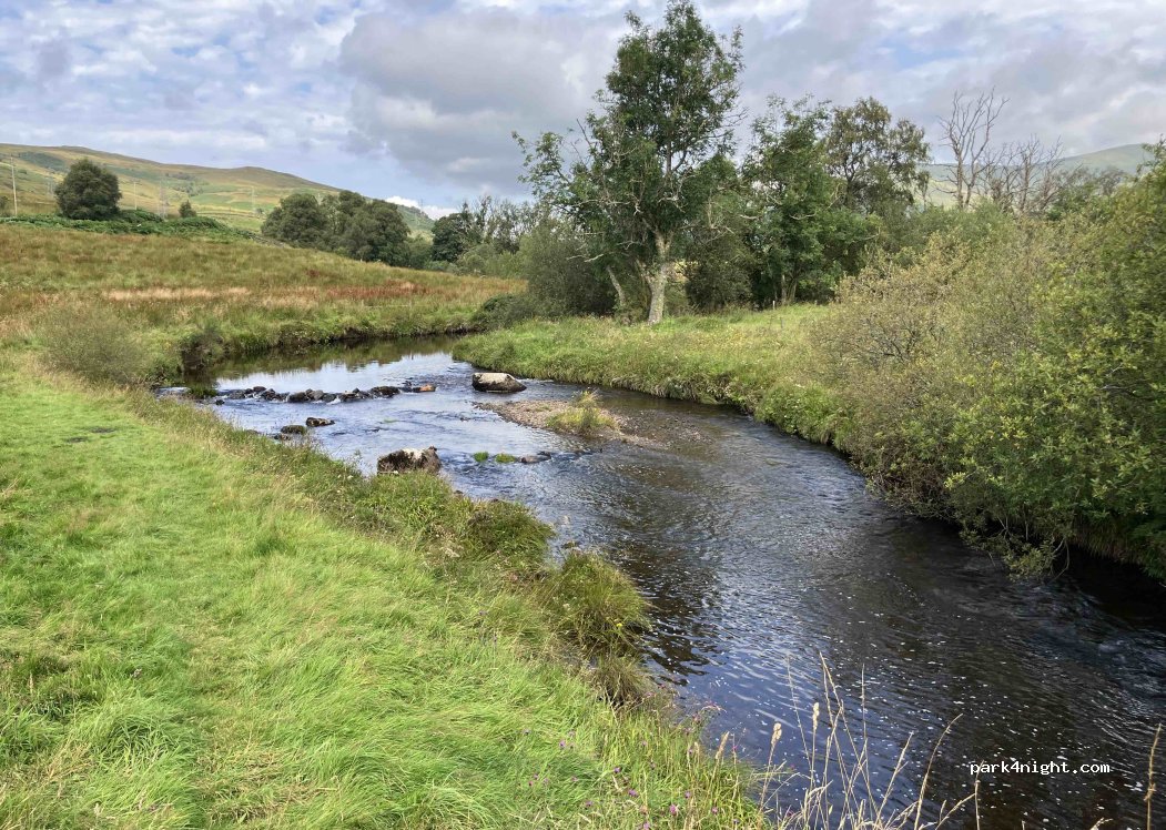 Langs een rustige weg. Er stonden nog kampeerders toen ik er was in augustus. Je kan baden in de rivier en op zonnige dagen komen er ook locals zwemmen. En ik maakte een verrassend mooie wandeling vanaf deze plek; door de koeienweides en een bos waar we een hertje konden spotten, en langs het Hill House.