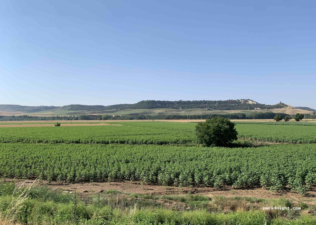 A calm place to spent a night, not side by side with the motorway so you can rest with silence and birds singing in the morning. This is the park of the cemetery and there’s nearby a visigothic church “ San Juan de Baños”. Very recommendable and even with some chades.