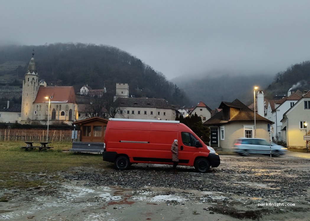 Stayed one night. Closer to the road I think than the one at Oberloiben as traffic noise louder. Ear plugs definately needed. Very pretty spot. Pitch black at night to watch the stars. Not really gravel, more sandy ground. Busy in the morning with people frequenting the stall. This is a public parking area. Free.
