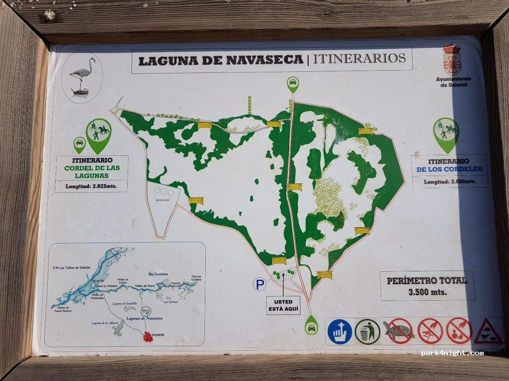 Parking au bord de la lagune de Navaseca, sans service. Il n'y a pas de panneau d'interdiction. Circuit jusqu'au lagon de 3 km à pied, avec des observatoires et de nombreux oiseaux à voir. Calme et convivial.