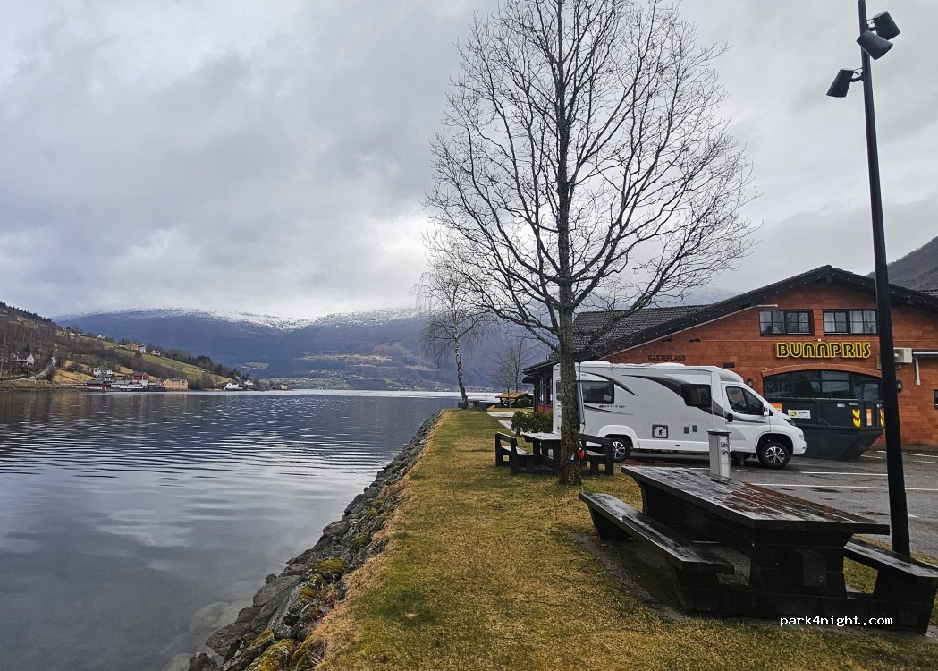 Just a very handy place to break a journey. The staff in Bunnpris were really friendly and very helpful. No problem in finding something to eat with a supermarket next door! Nice view of the Fjord and a glimpse of the totally empty and more expensive aire across the river. Road wasn't busy overnight. Just what we needed and would recommend.