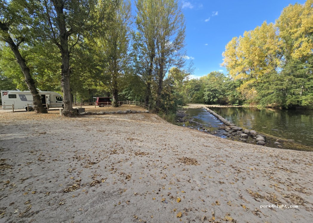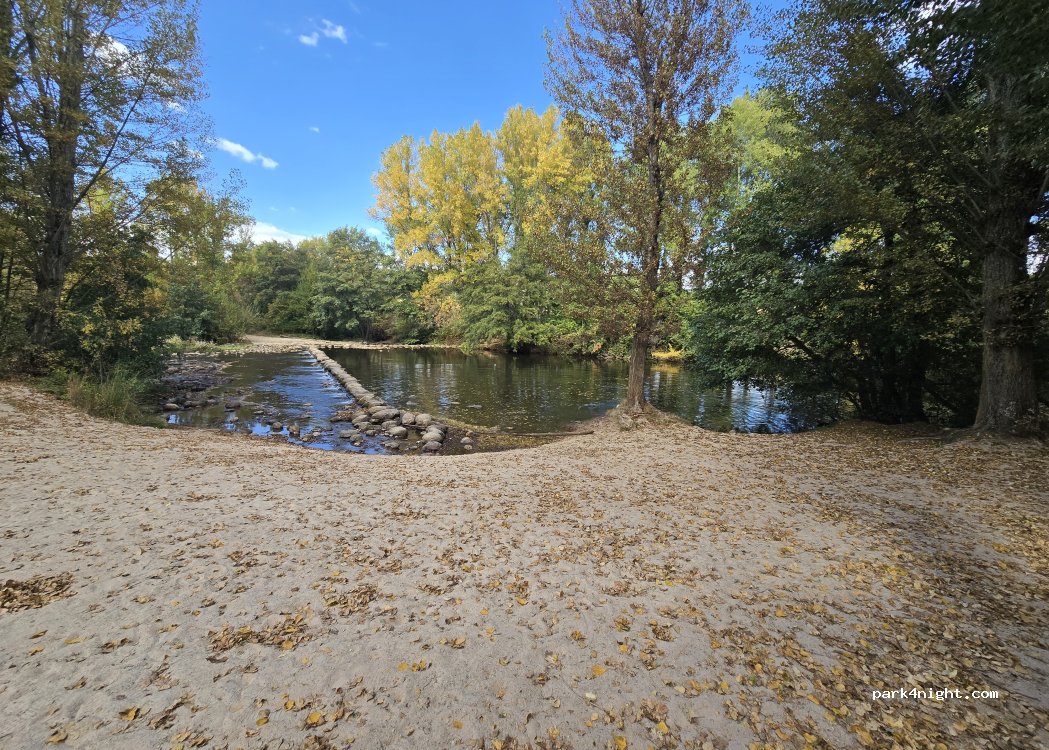 Small parking lot on the banks of the Arlanza River, picnic area with barbecues and tables, plenty of shade and cool, quiet during the week, perfect to go with kennels, start of route of a stretch of the road of El Cid. There is no water source, but there is a chiringuito next door and containers for garbage.
