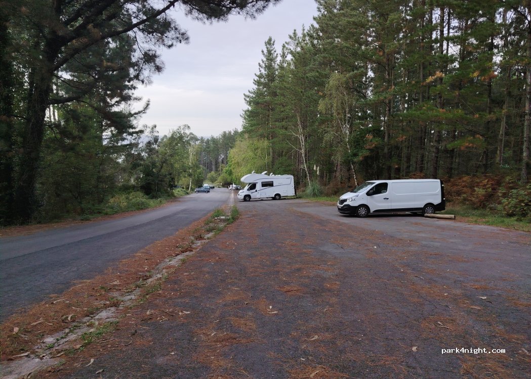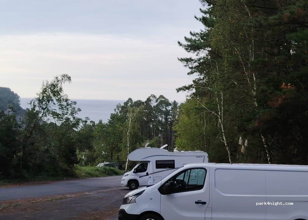 So pleased to find this place calm except for a few dogs barking! We were 4 sets of people staying here, steep parking, not for very large vans but up to 6m ok . Busy when we arrived 7.30pm, most people coming off the beach. Then peaceful. Bins. No facilities. Rocky beach down a very steep road, no parking near the beach. You must walk! No dogs near the beach or woods. So pleased to find this place after trying to park anywhere in Lekeitio just gave up! Vans over 5m are not wanted or needed there. There is a lifeguard 11am-8pm, looks like it could be dangerous to swim here at high tide.