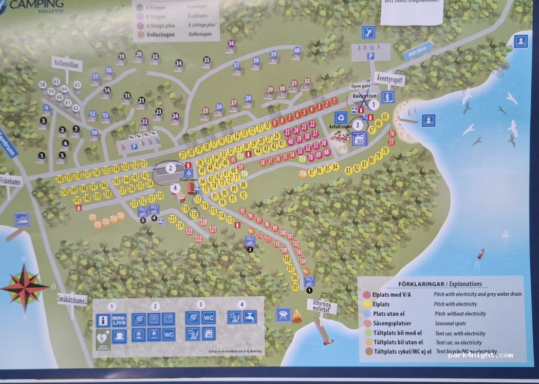 obwohl Campingplatz nur ca. 20 % belegt, darf man sich den Platz nicht aussuchen und bekommt einen Platz zugewiesen. Am Abreisetag muss man um 11:00!! Vormittags wieder den Platz verlassen haben. So gut wie keine Plätze direkt oder Sicht auf das Meer. (410 SEK incl. Strom) Es sind nur 2 Plätze ohne Strom vorhanden, bei belegt muss man einen Platz mit Strom mieten, obwohl man keinen Strom braucht!
