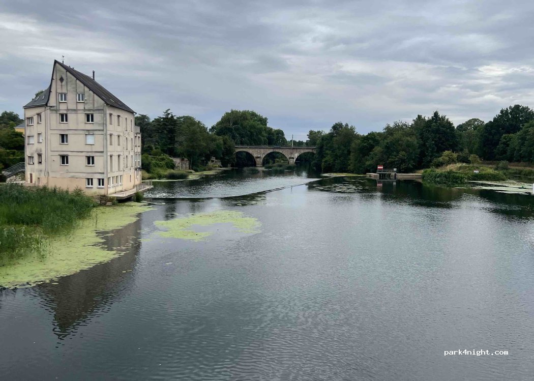 Il y a un problème : le parking face à la Sarthe est interdit aux camping-cars. On est rangé entre le camping et l'aire de jeux. Il n'est pas plat, il est humide et peu entretenu. 5 € pour l'électricité et l'emplacement.