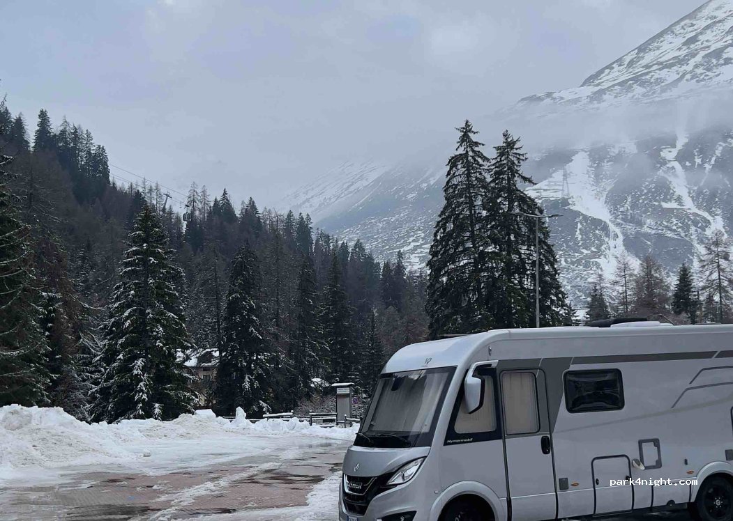 Area Attrezzata a pagamento a 450m dalla funivia. 20.-eur/24h. 2 docce calde (1.- eur/4min). Camper service e elettricità inclusa. Ca.60-70 posti camper.