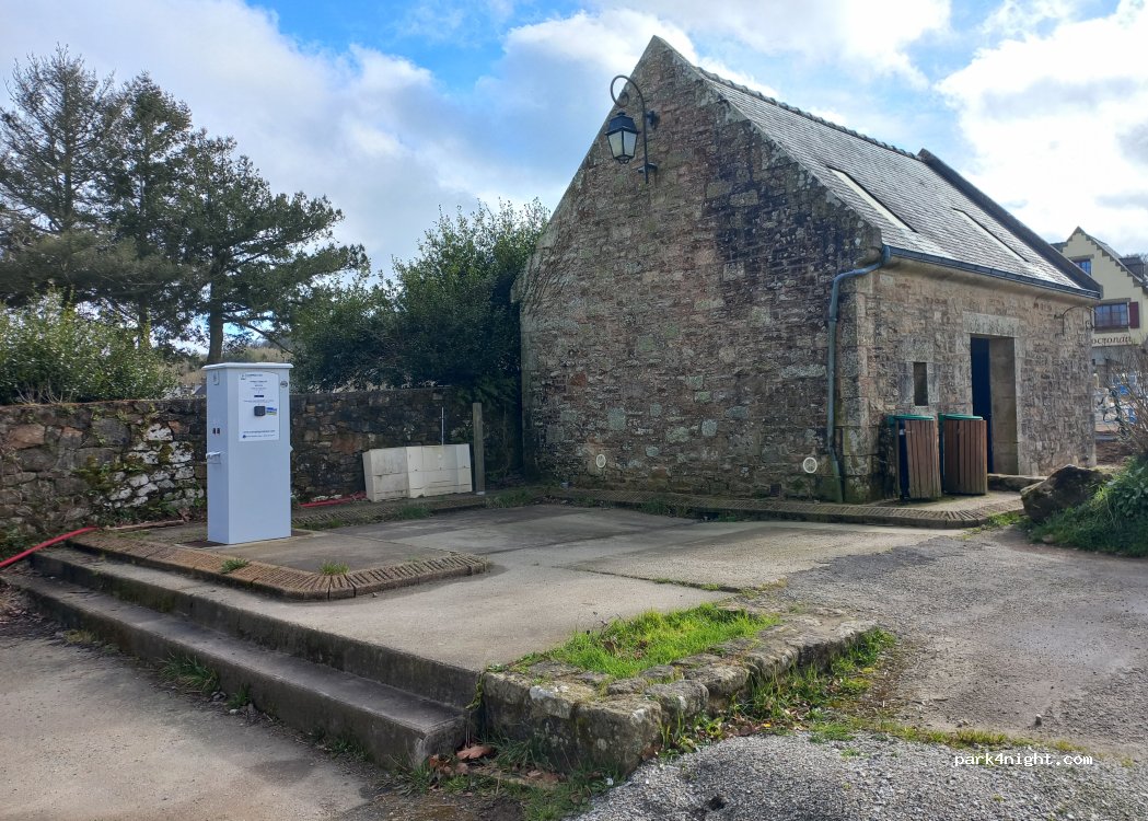 parking a l’entrée du village typiquement breton et interdit aux véhicules,6e pour 2h , wc public a l’entrée, vidange eau grise et wc , remplissage d’eau. terrain très en pente .