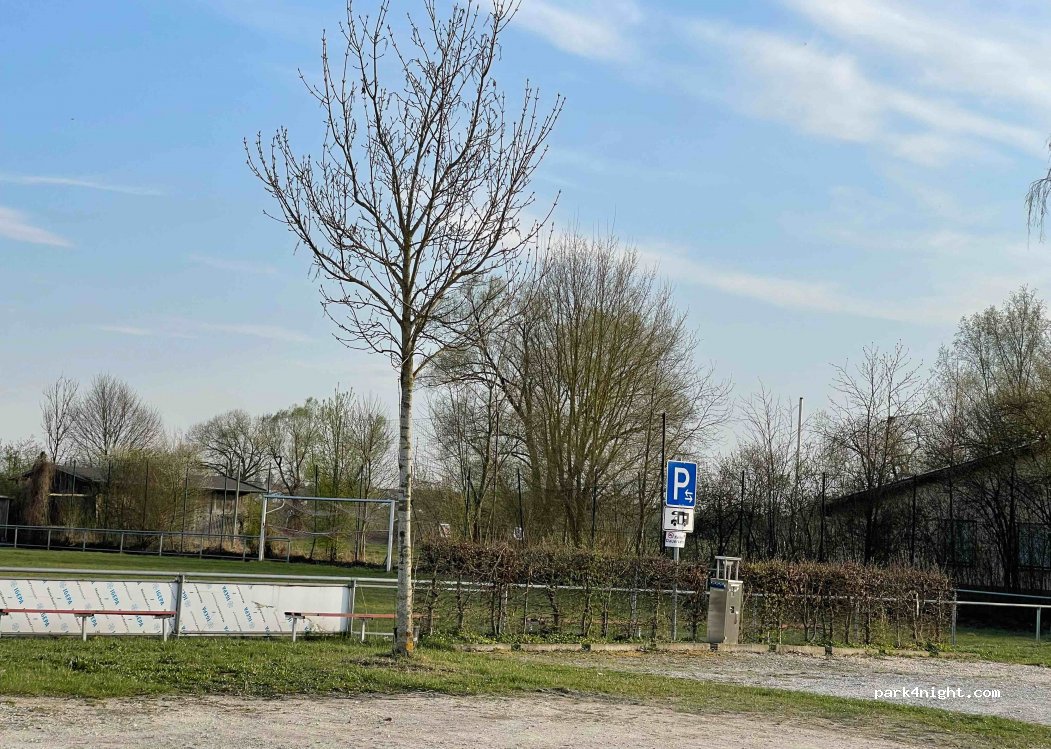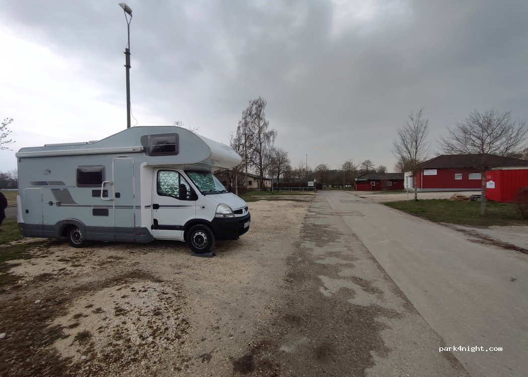 Großer Parkplatz (10€ night) am Sportplatz mit Servicebereich für Wohnmobile und zwei ausgewiesene Parkplätze für Wohnmobile. Strom (4 Steckdosen), Schwarz- und Grauwasserabfluss. Sehr ruhige Nacht, wochentags ab 6 Uhr morgens vorbeifahrende Lastwagen auf der nahegelegenen Straße. Kleiner Biergarten im Freibad nebenan.