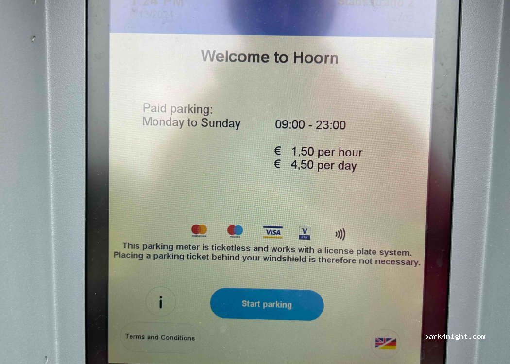 Grote parkeerplaats. Betaald tot 21 uur op weekdagen of 18 uur op zaterdag. Gratis op zondag. Geen services.