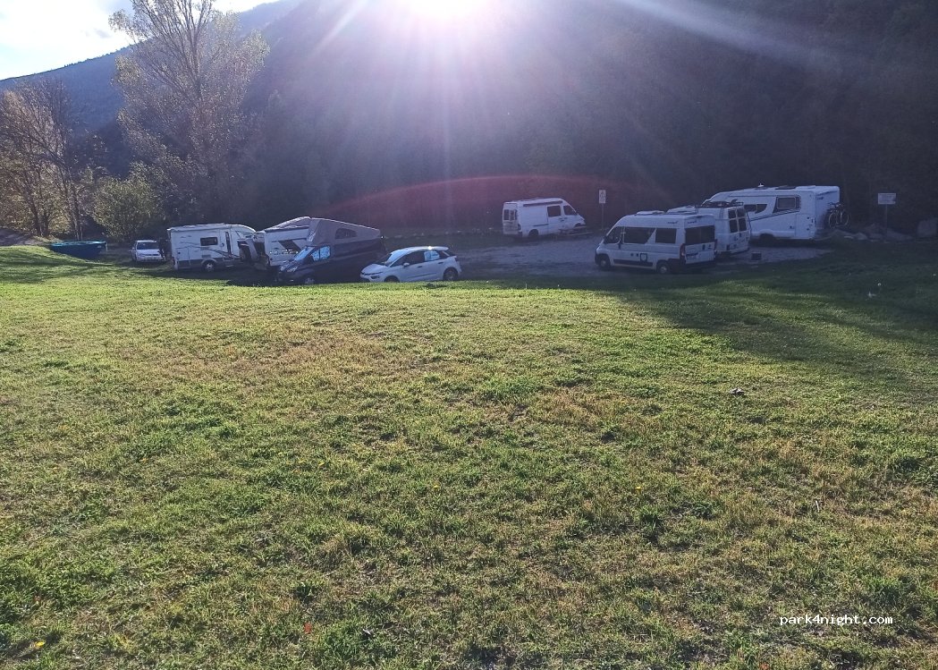 es un parking de tierra pequeño, seríamos unas 10 furgos/ac. sin servicios, cerca del río, te puedes bañar. un poco apartado del pueblo, pero ideal para hacer una caminata alrededor del río. hay mesas de picnic de madera mucha gente con mesas de camping... incluso unos con una tienda de camping... hay que respetar para que no nos echen de los sitios.